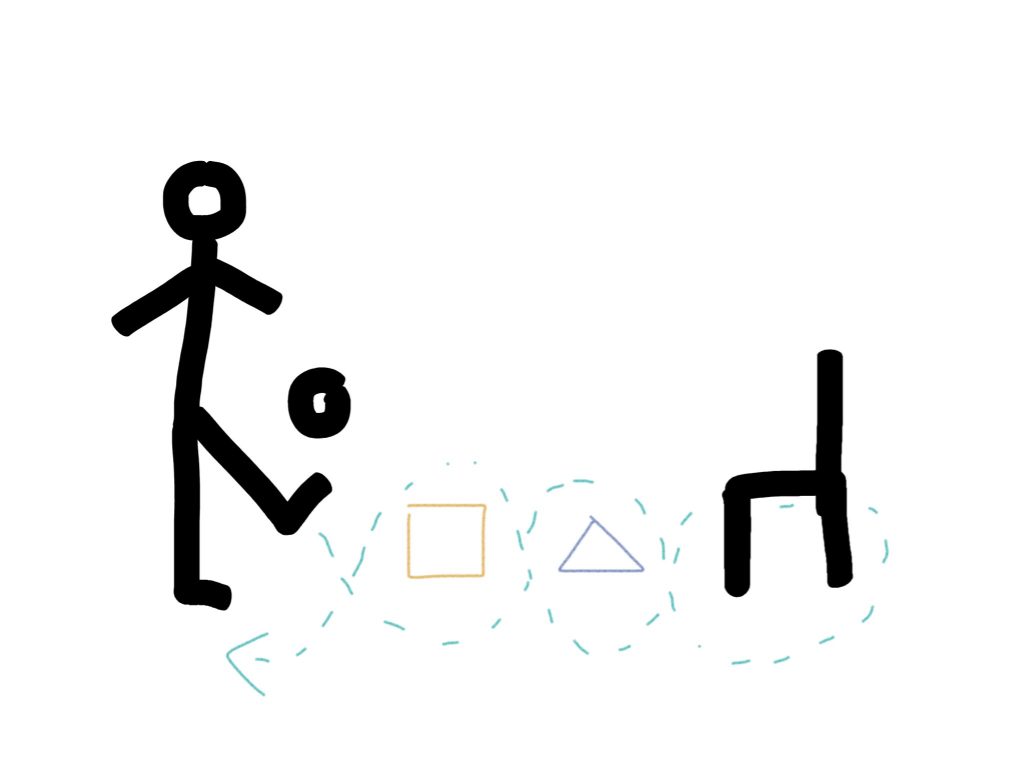 Жонглирование. Вчерашнюю табуретку не убираем, а усложняем. На пути к ней кладём на пол две игрушки и змейкой жонглируем. Задача: обойти табуретку и вернуться в исходную точку, игрушки не задеваем, а мяч не роняем. Поехали.