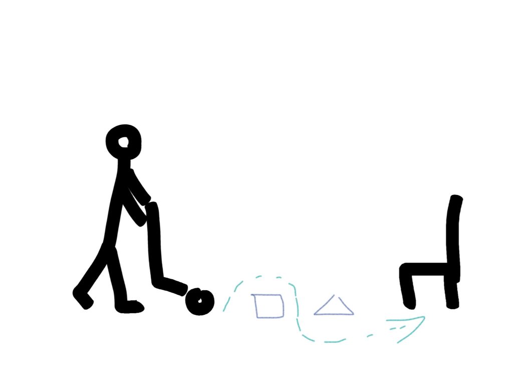 Выбираем себе что-нибудь в качестве клюшки: игрушечную клюшку, клюшку от гольфа, снеголепку, зонтик, да что угодно. И шайбу или маленький мяч. Ставим перед собой фишки или игрушки, их будем обводить. И стул в качестве ворот. Задача — ведение клюшкой и забить гол.